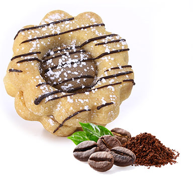 Farina di GRANO tenero tipo “00”, margarina vegetale, acqua, sale (0,6%), emulsionanti, conservante (E202), aromi, colorante (betacarotene), zucchero, vanillina, cacao, aromi in pasta caffè.